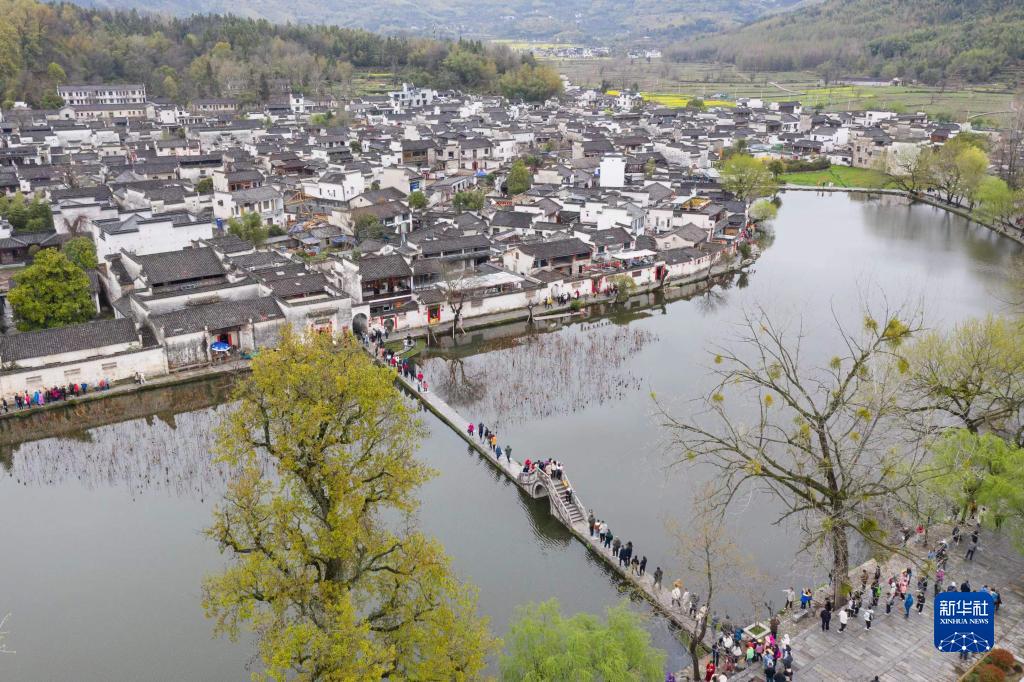 3月24日,游客在黟縣宏村南湖游覽(無(wú)人機照片)。