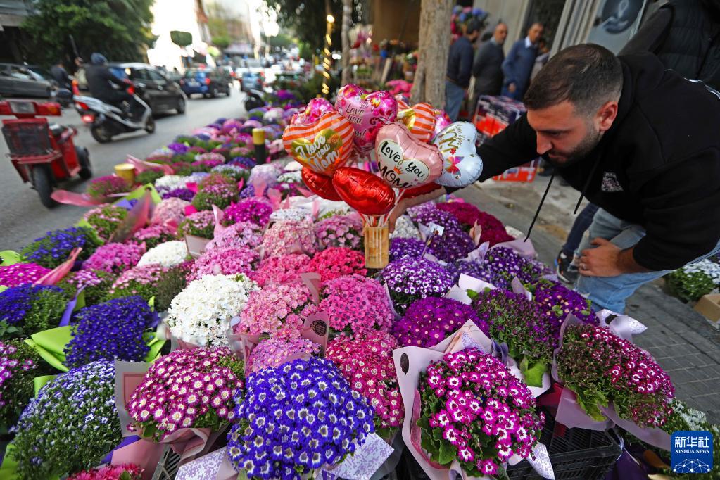 3月20日,在黎巴嫩首都貝魯特,花店工作人員整理為母親節準備的鮮花和氣球。