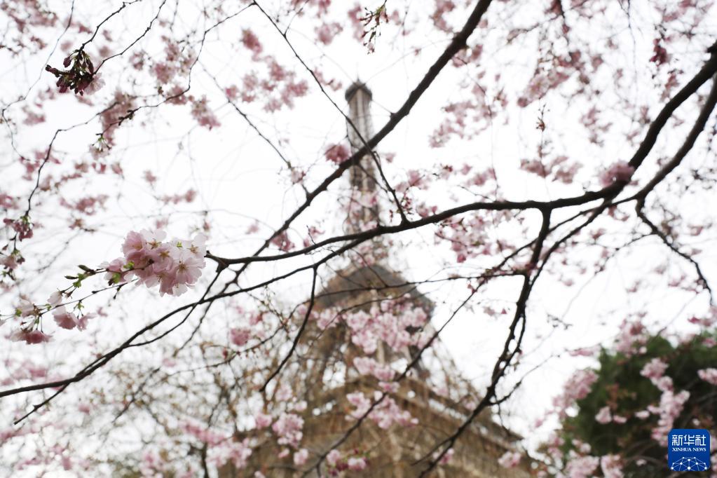 3月19日,法國巴黎埃菲爾鐵塔下春花綻放。