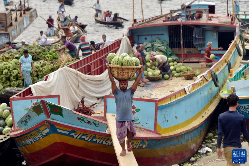 3月21日,工人在孟加拉國達卡的一座批發(fā)市場(chǎng)附近搬運西瓜。