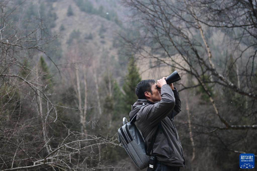 3月24日,在青海省黃南藏族自治州麥秀林場(chǎng),護林員使用望遠鏡巡護林區。