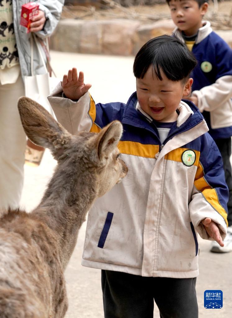 3月24日,小朋友在銀基動(dòng)物王國和梅花鹿互動(dòng)。