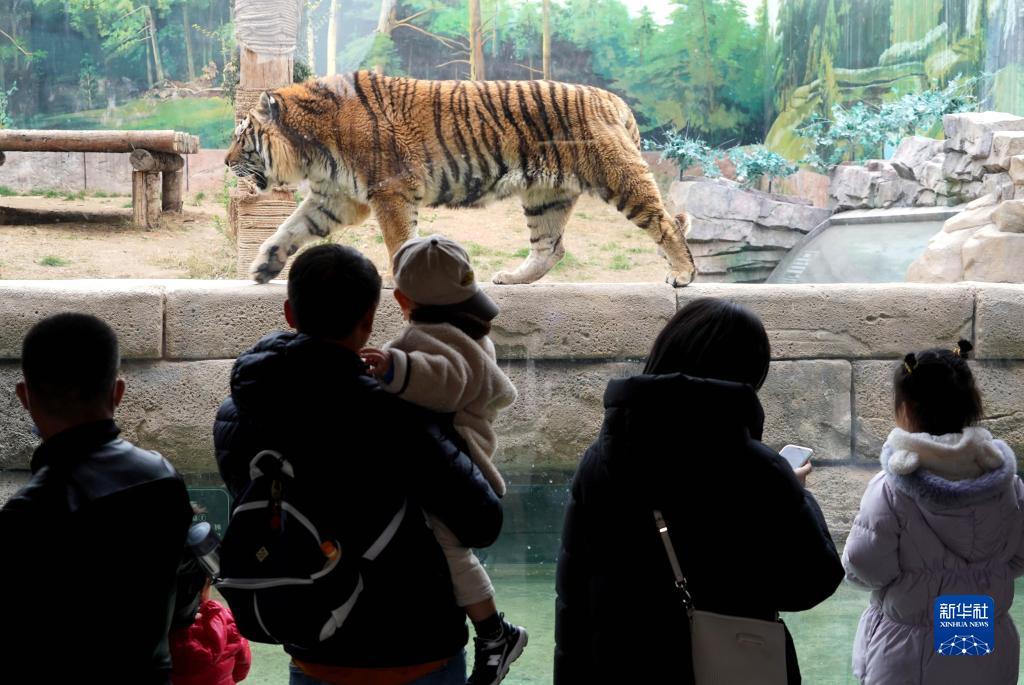 3月24日,游客在銀基動(dòng)物王國內觀(guān)看老虎。