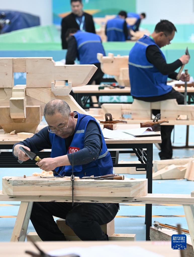 參加木作文物修復師比賽項目的選手在現場(chǎng)制作木質(zhì)傳統建筑構件(3月25日攝)。