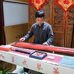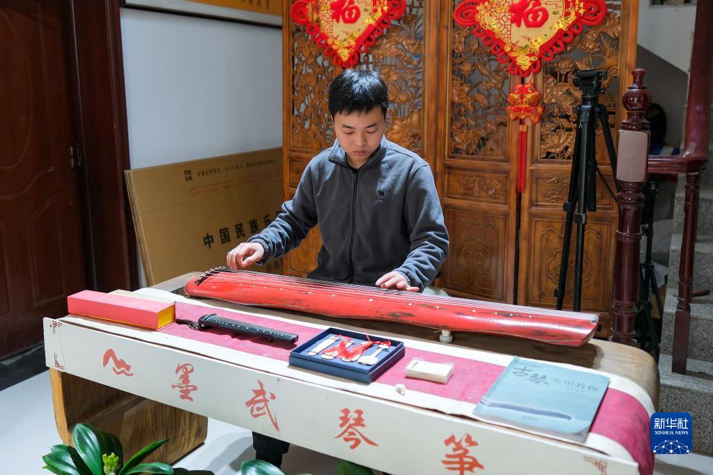 3月25日,斫琴師徐亞沖在徐場(chǎng)村墨武琴坊里彈奏古琴。