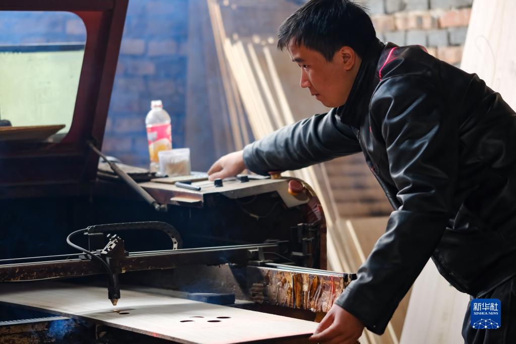 3月25日,村民在徐場(chǎng)村一處民族樂(lè )器家庭作坊里制作古箏。