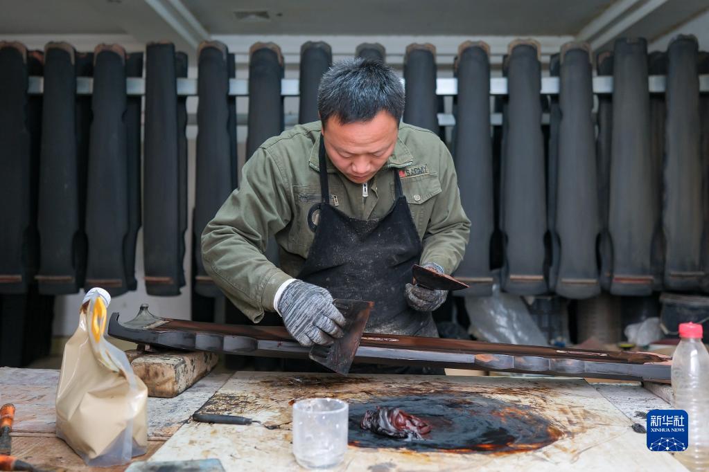 3月25日,村民在徐場(chǎng)村一處民族樂(lè )器家庭作坊里制作古琴。