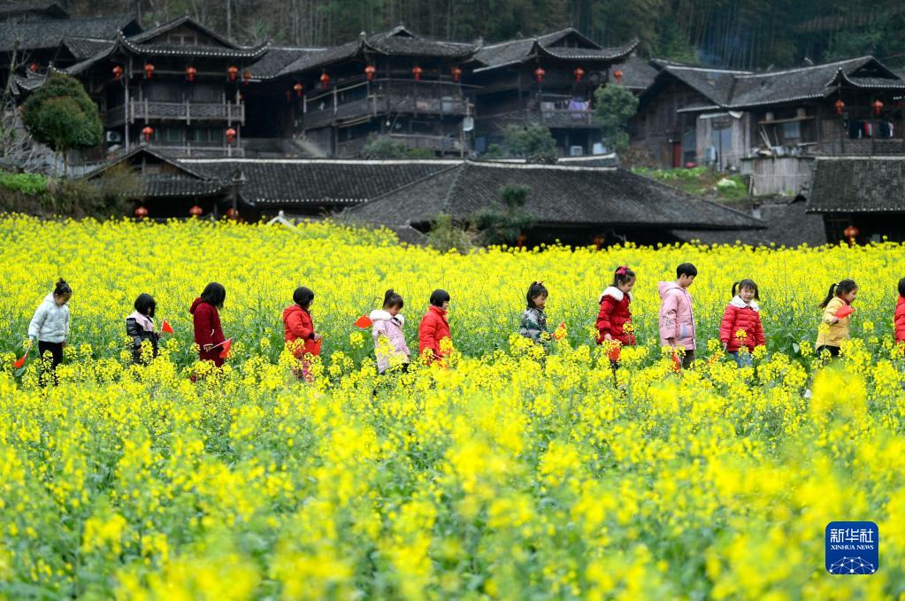 3月18日,孩子們在湖北省宣恩縣彭家寨古吊腳樓前的油菜花田里行走。