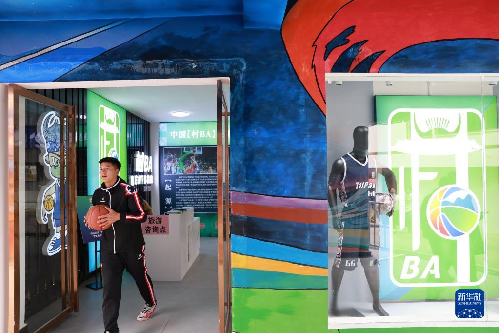 3月25日,一名籃球愛(ài)好者從“村BA官方線(xiàn)下體驗館”內走出。