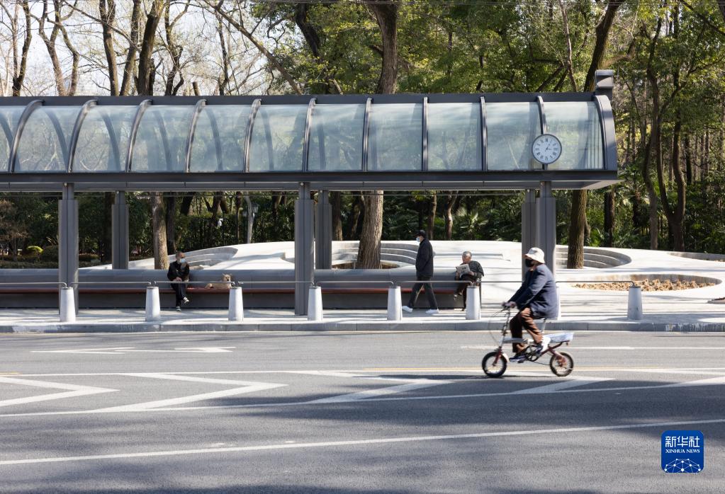3月13日,市民在中山公園附近的車(chē)站等待公交車(chē)。