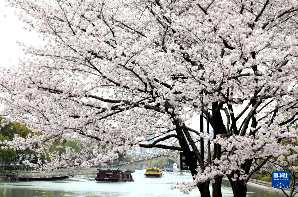 3月25日,在江蘇蘇州環(huán)古城河,游船與岸邊盛開(kāi)的櫻花相映成景。