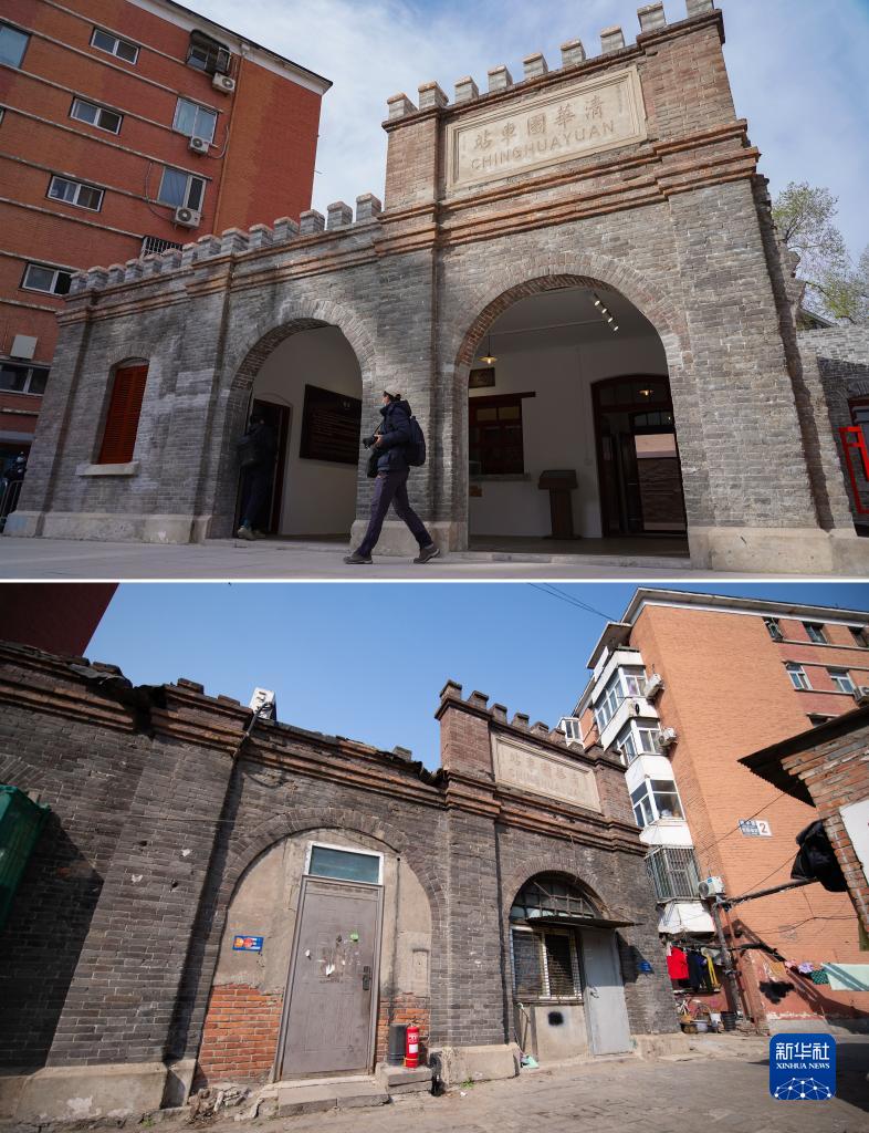 這是一張拼版照片:上圖是修繕后對外開(kāi)放的清華園車(chē)站舊址(2023年3月25日攝);下圖是修繕前的清華園車(chē)站舊址(2021年4月7日攝)。