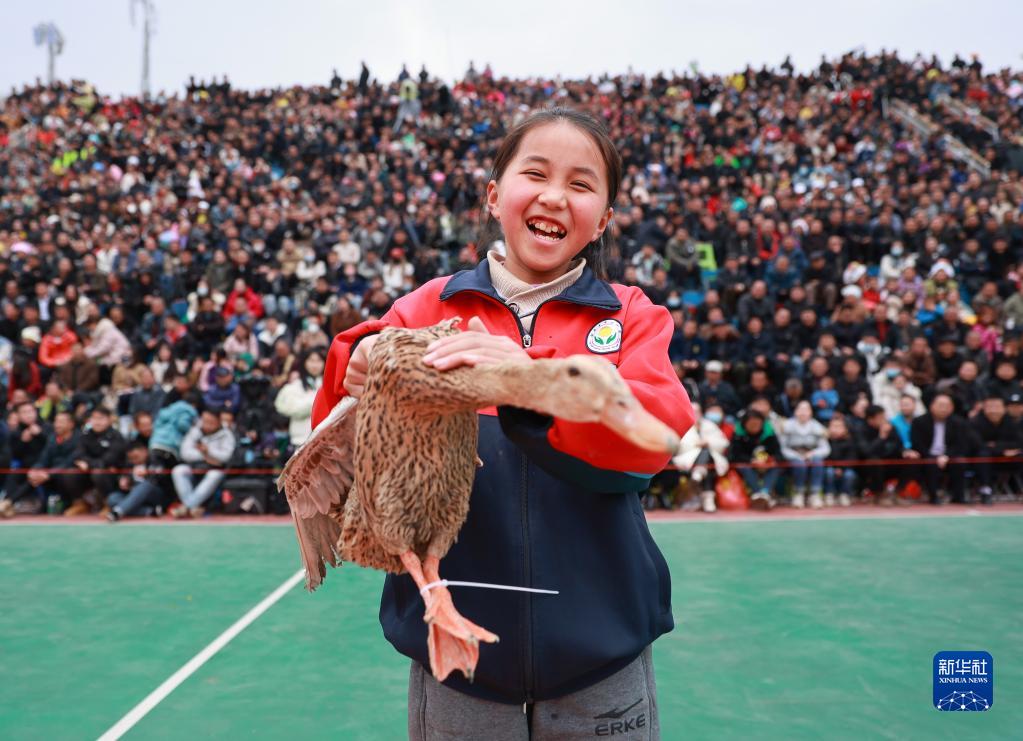 3月26日,當地小學(xué)生李文文在賽前投籃游戲中獲得鴨子作為獎品。
