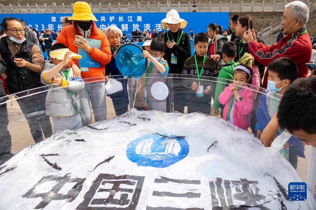 3月26日,小朋友在活動(dòng)現場(chǎng)放流中華鱘。