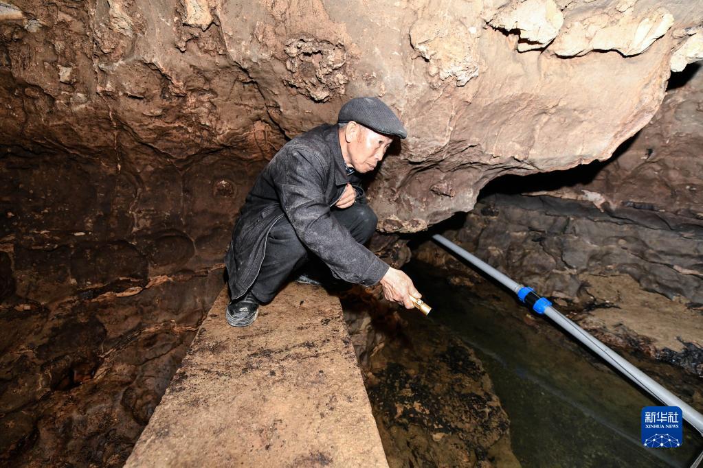 管水員陳光明在貴定縣盤(pán)江鎮馬場(chǎng)河村的溶洞水源點(diǎn)查看蓄水情況(3月23日攝)。