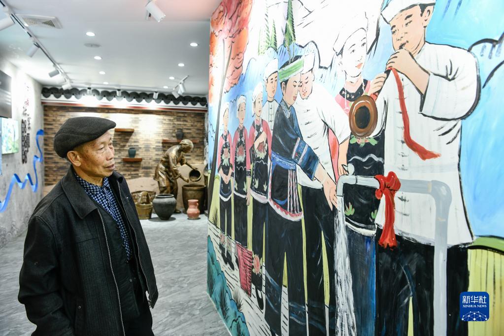 在龍里縣冠山街道高坪村,管水員陳光明在參觀(guān)農村飲水安全管理陳列館(3月23日攝)。