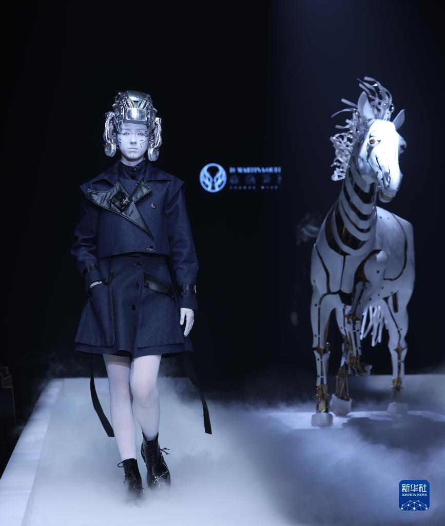 當日,主題為“視界·邊界”的時(shí)裝秀在北京舉行的中國國際時(shí)裝周2023秋冬系列上上演。設計師丁潔以婦好鸮尊為設計靈感,模特佩戴3D打印發(fā)飾,繞行秀場(chǎng)特別設置的“戰馬”,上演了一場(chǎng)歷史與未來(lái)“時(shí)空對話(huà)”的時(shí)裝秀。