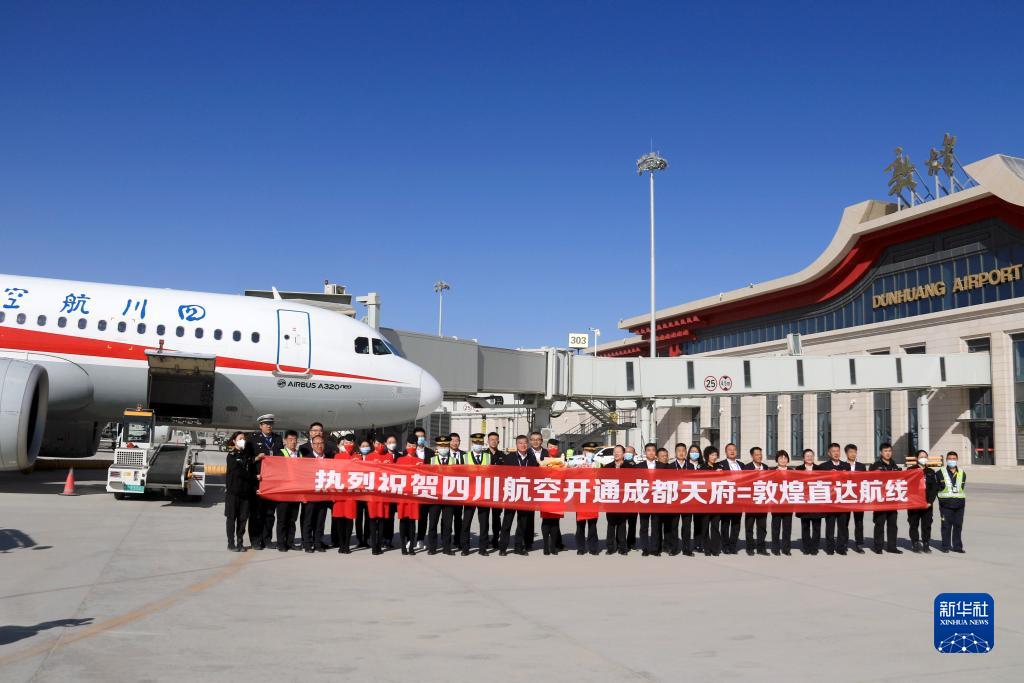 3月26日,由四川航空公司執飛的成都至敦煌往返直達航線(xiàn)正式通航。這是首航航班機組人員與機場(chǎng)工作人員在甘肅敦煌莫高國際機場(chǎng)合影。