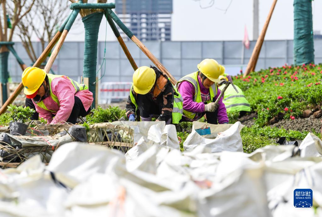 3月27日,在四川省成都市郫都區世界科幻公園建設現場(chǎng),中建四局的施工人員在進(jìn)行綠化作業(yè)。