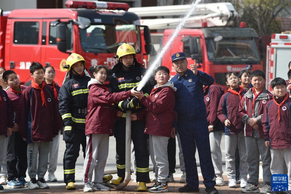 3月27日,在江蘇省宿遷市蘇州外國語(yǔ)學(xué)校,學(xué)生在消防員的指導下體驗消防水槍。