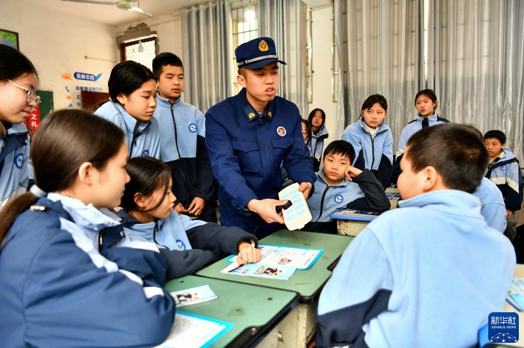 3月27日,在四川省廣安市前鋒區龍塘學(xué)校,消防員向學(xué)生講解安全用電知識。
