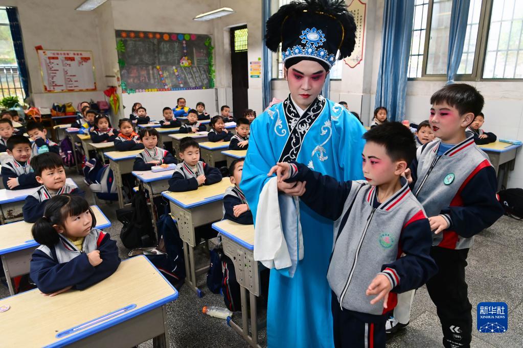 當日是世界戲劇日,江西省宜春市萬(wàn)載縣花燈戲劇團演員來(lái)到當地第二小學(xué),為學(xué)生們講解和表演花燈戲,讓孩子們近距離感受傳統戲劇文化的魅力。