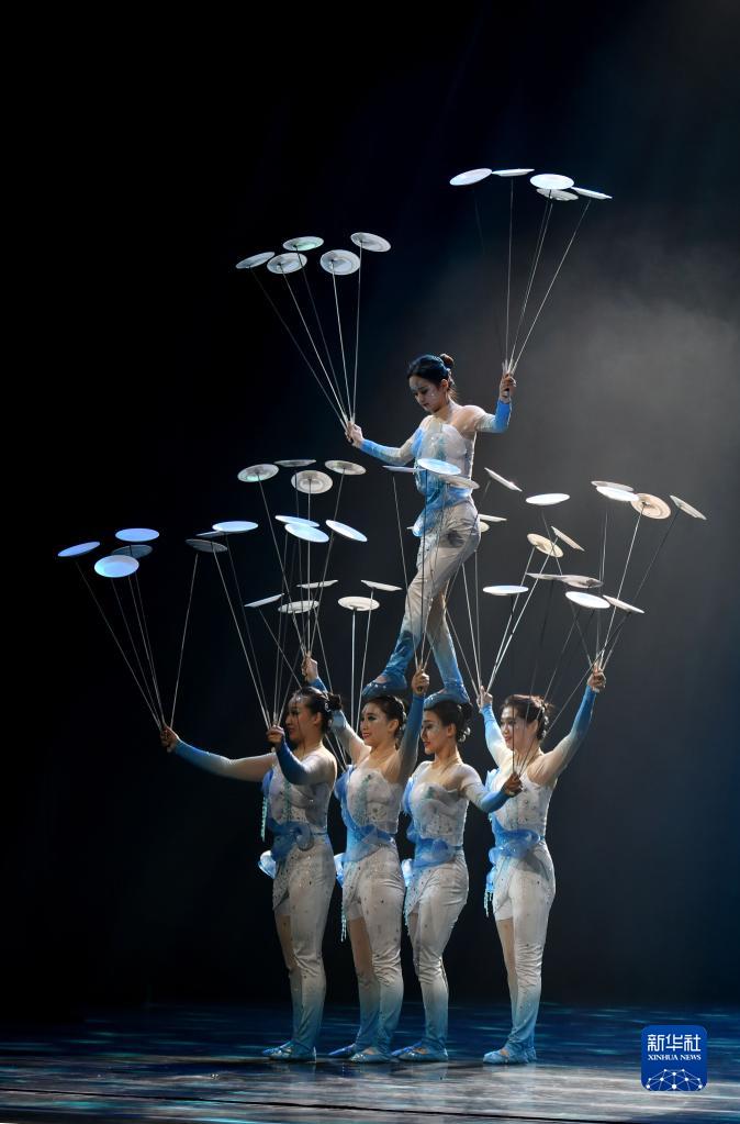 3月27日晚,在位于山東省濟南市的山東劇院,演員表演雜技節目《集體花盤(pán)》。