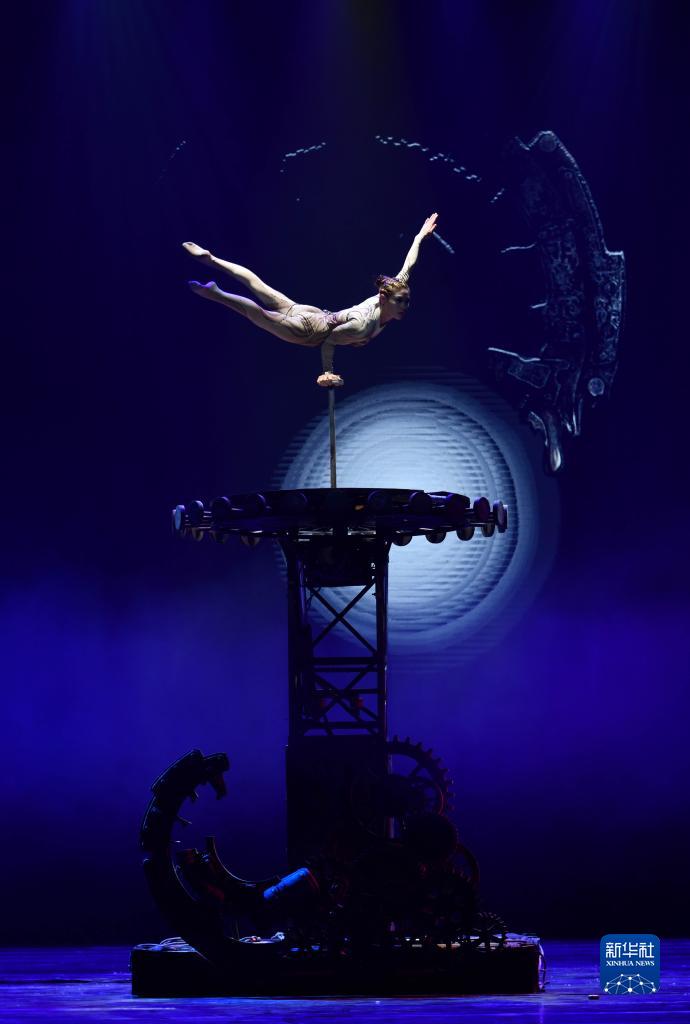 3月27日晚,在位于山東省濟南市的山東劇院,演員表演雜技節目《煉·倒立技巧》。