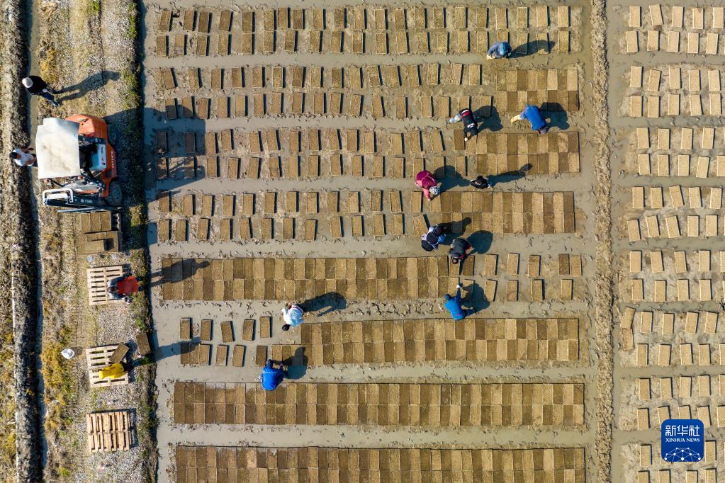 3月28日,在浙江省余姚市黃家埠鎮上塘村,農民在稻田里擺放早稻機插秧盤(pán)(無(wú)人機照片)。