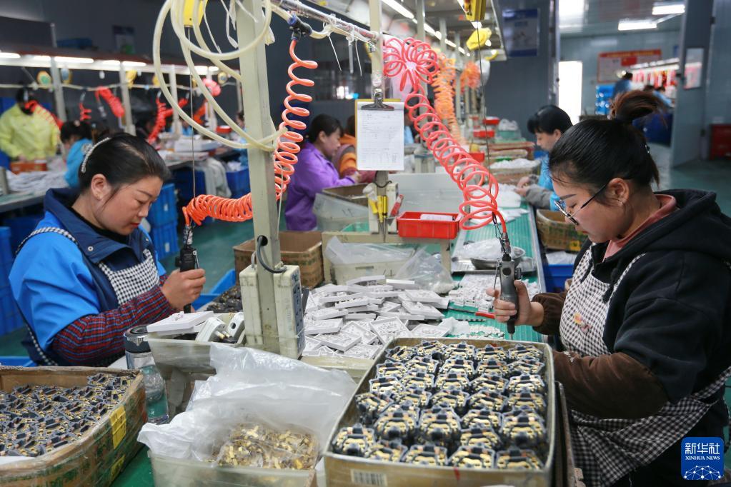 3月28日,在淮北市杜集區石臺鎮農民工創(chuàng )業(yè)園,一家開(kāi)關(guān)生產(chǎn)企業(yè)的工人在車(chē)間內忙碌。