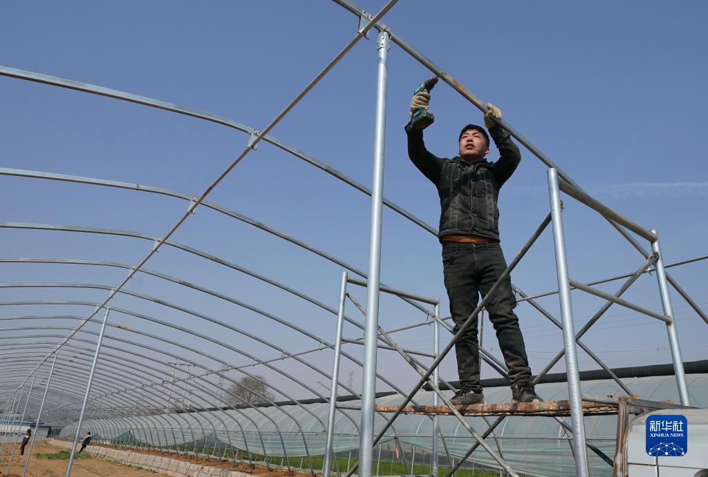 3月28日,工人在秦皇島市海港區海陽(yáng)鎮青石山村為準備開(kāi)辦家庭農場(chǎng)的農民建設大棚。