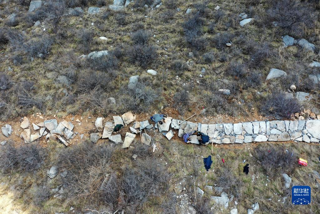 在山西省壺關(guān)縣大峽谷鎮青龍峽村,村民們在山上修路(3月7日攝,無(wú)人機照片)。新華社記者 詹彥 攝