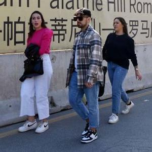 3月26日,游客走過(guò)意大利羅馬斗獸場(chǎng)的中文指示牌。