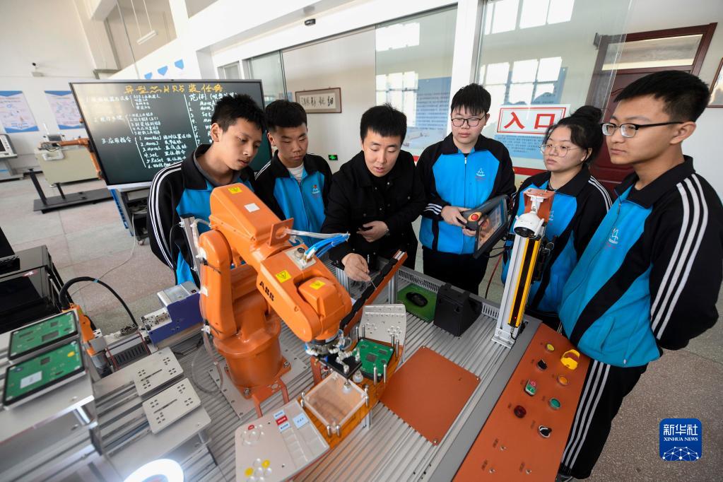 3月28日,在興隆縣職教中心,學(xué)生在進(jìn)行工業(yè)機器人應用實(shí)訓。