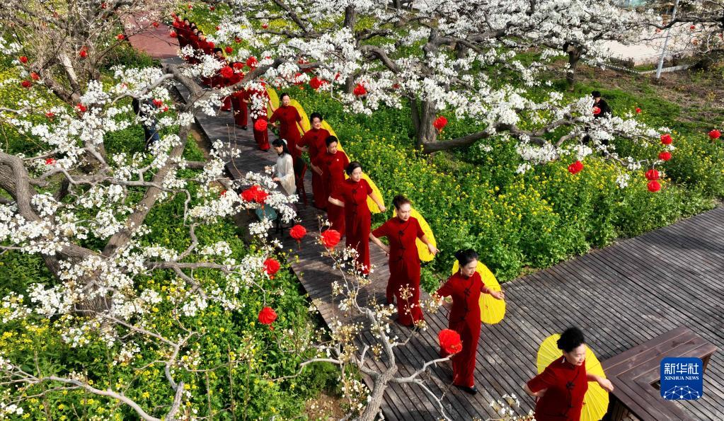 3月28日,旗袍愛(ài)好者在石家莊市趙縣梨果生產(chǎn)基地觀(guān)光區表演旗袍秀(無(wú)人機照片)。