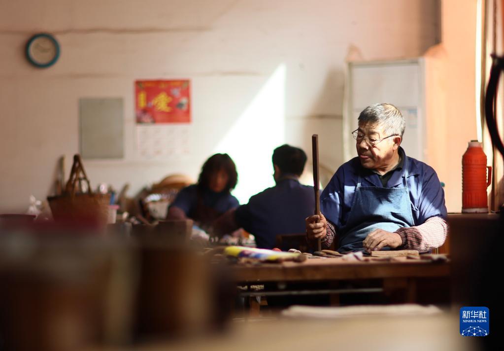 3月28日,在江蘇無(wú)錫梅村街道二胡產(chǎn)業(yè)園,工人在制作琴桿。