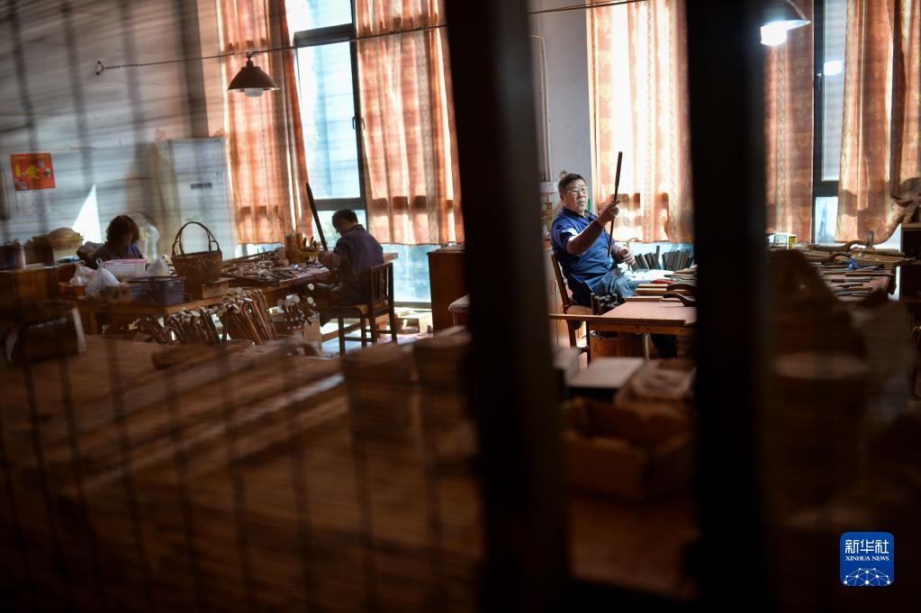 3月28日,在江蘇無(wú)錫梅村街道二胡產(chǎn)業(yè)園,工人在制作二胡。