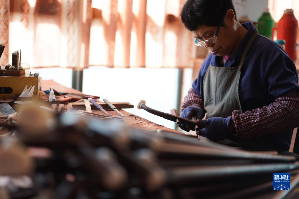 3月28日,在江蘇無(wú)錫梅村街道二胡產(chǎn)業(yè)園古月琴坊車(chē)間,工人在制作二胡。