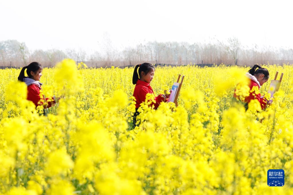 3月28日,江蘇省泗洪縣龍集中心小學(xué)的學(xué)生在一片油菜田里寫(xiě)生。
