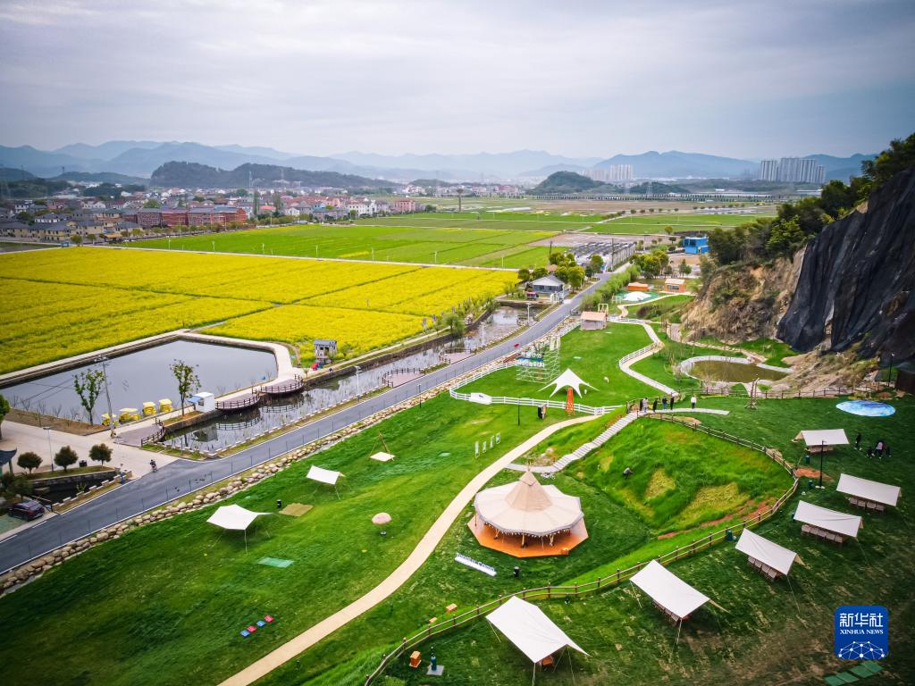 這是3月29日拍攝的諸暨市楓橋鎮杜黃新村用廢棄礦山改造的露營(yíng)旅游地(無(wú)人機照片)。