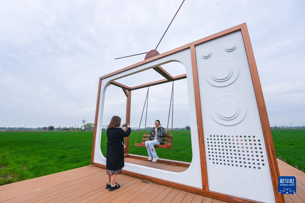 3月29日,游客在浙江省湖州市東林鎮東華村經(jīng)過(guò)土地綜合整治后建成的高標準農田旁的景觀(guān)點(diǎn)游玩。