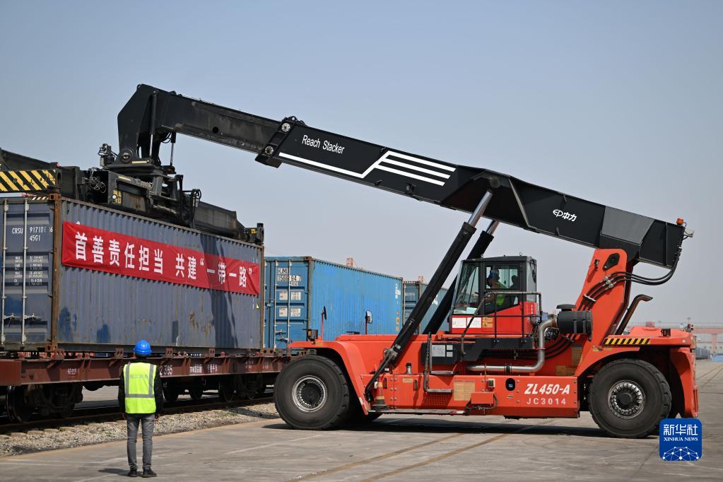3月29日,在天津開(kāi)發(fā)區盛鐵物流有限公司,吊裝車(chē)輛進(jìn)行集裝箱裝車(chē)作業(yè)。