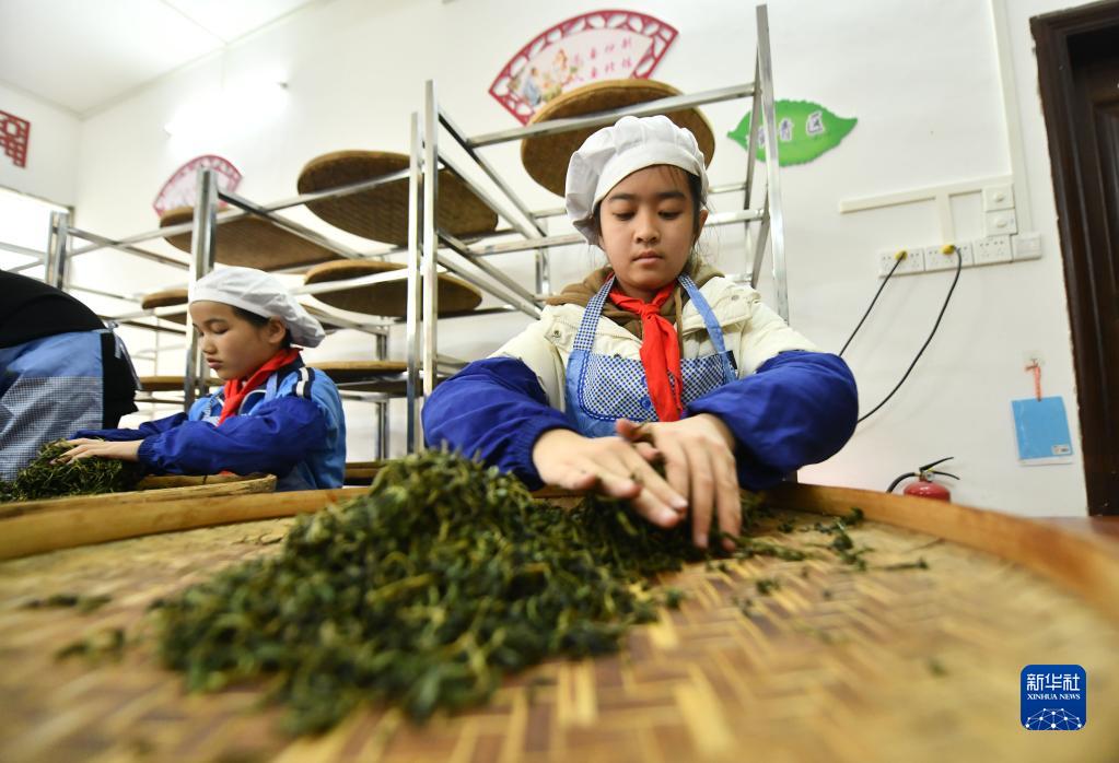 3月29日,在廣西梧州市蒼梧縣六堡鎮中心校,小學(xué)生們在學(xué)習制茶。