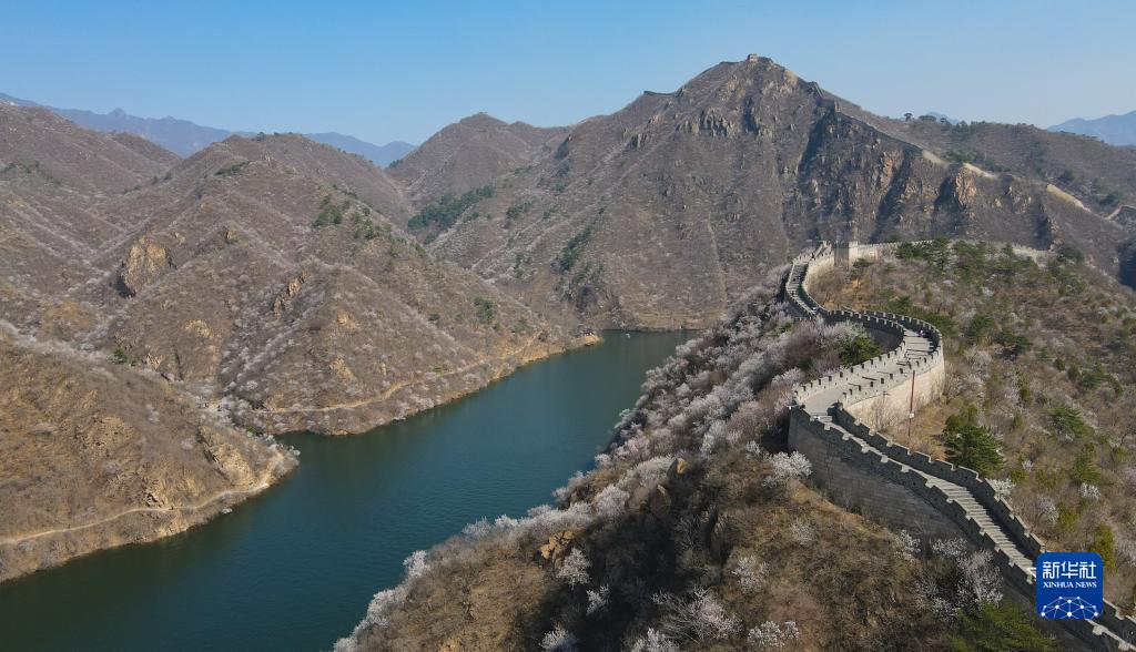 這是3月29日拍攝的黃花城水長(cháng)城春色(無(wú)人機照片)。