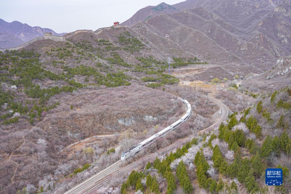 列車(chē)行駛在居庸關(guān)長(cháng)城腳下(3月23日攝)。