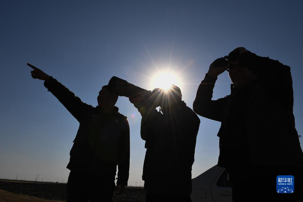 3月28日,在吉林省白城市鎮賚縣濕地,中國野生動(dòng)物保護協(xié)會(huì )吉林白城護飛隊隊員王凱(左)、姜海濤(中)和劉聰觀(guān)察、拍攝候鳥(niǎo)遷徙。