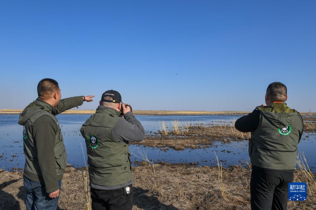 3月28日,在吉林省白城市鎮賚縣濕地,中國野生動(dòng)物保護協(xié)會(huì )吉林白城護飛隊隊員王凱(左)、姜海濤(中)和劉聰觀(guān)察、拍攝候鳥(niǎo)遷徙路線(xiàn)。