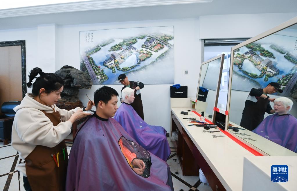 3月30日,聾啞人王曉珍(左一)和丈夫董華良在給盲人門(mén)球隊的隊員們義務(wù)理發(fā)。