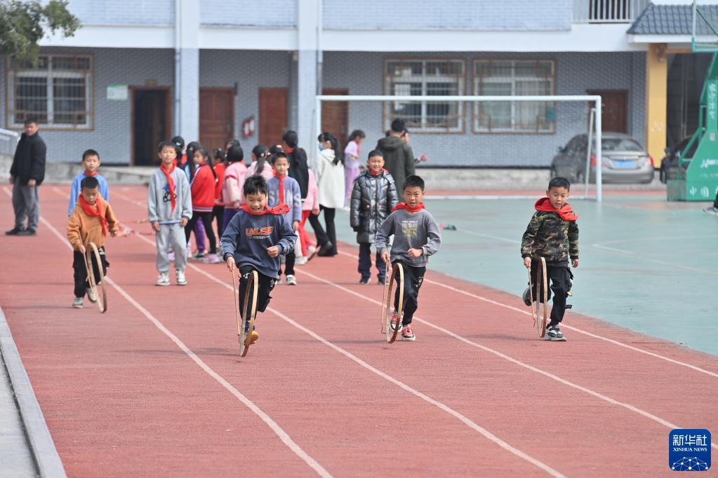 在廣西梧州市蒙山縣夏宜民族學(xué)校,學(xué)生們在體育課上滾竹環(huán)(2月22日攝)。