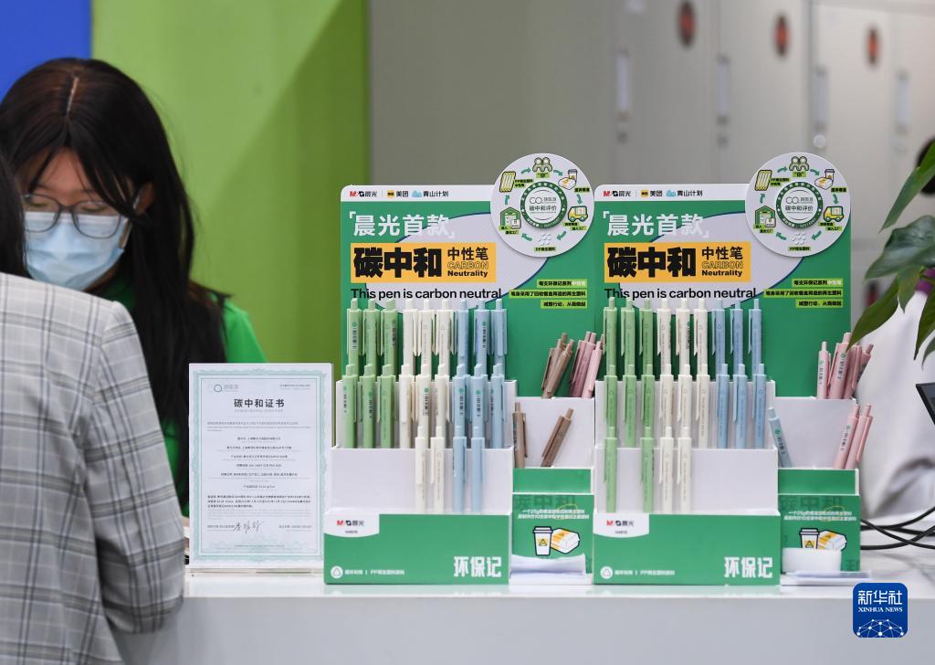3月28日在博鰲亞洲論壇新聞中心拍攝的供記者體驗使用的碳中和中性筆。這些筆的筆身用回收餐盒再造的再生塑料制作。